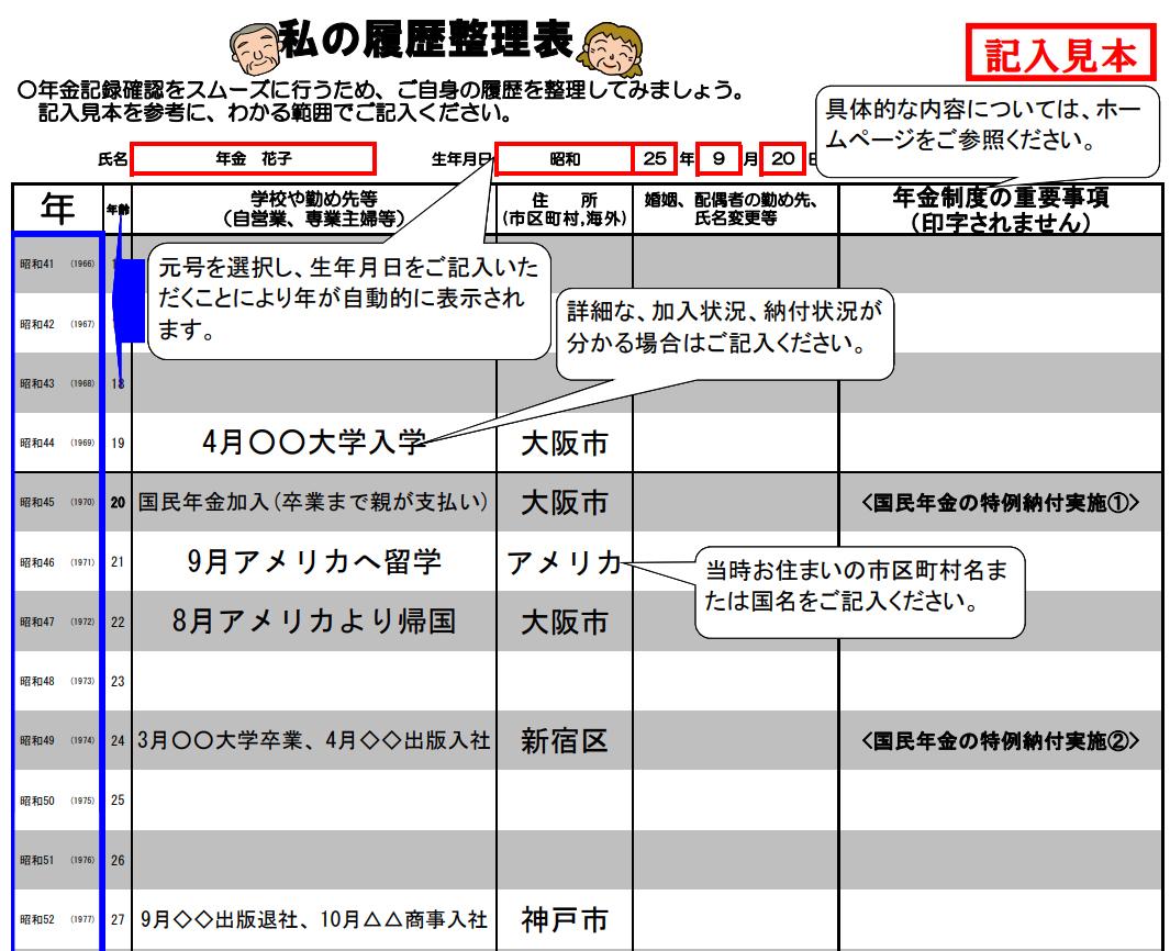 私の履歴整理表は、ねんきんネットに登録することで利用できる、自分の履歴を整理するためのシートです。入学や就職、退職などのタイミング、住んでいた市区町村、結婚による氏名の変更、事業を始めた時など、自分の履歴を整理できます。私の履歴整理表は、日本年金機構のウェブサイトからエクセルファイルでダウンロードできます。年金事務所にも備え付けてあります。