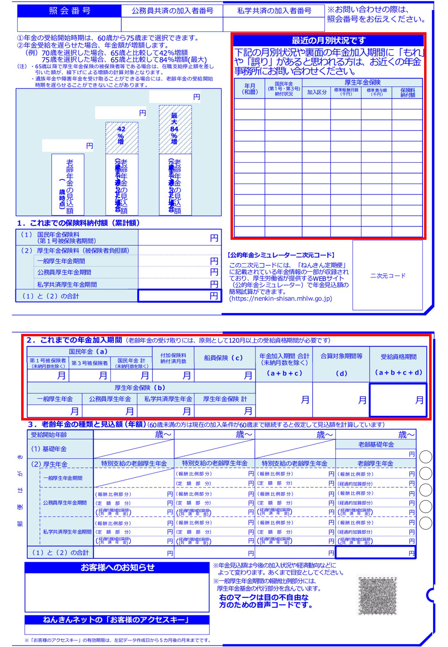 <ねんきん定期便の例(50歳以上・ハガキ)>