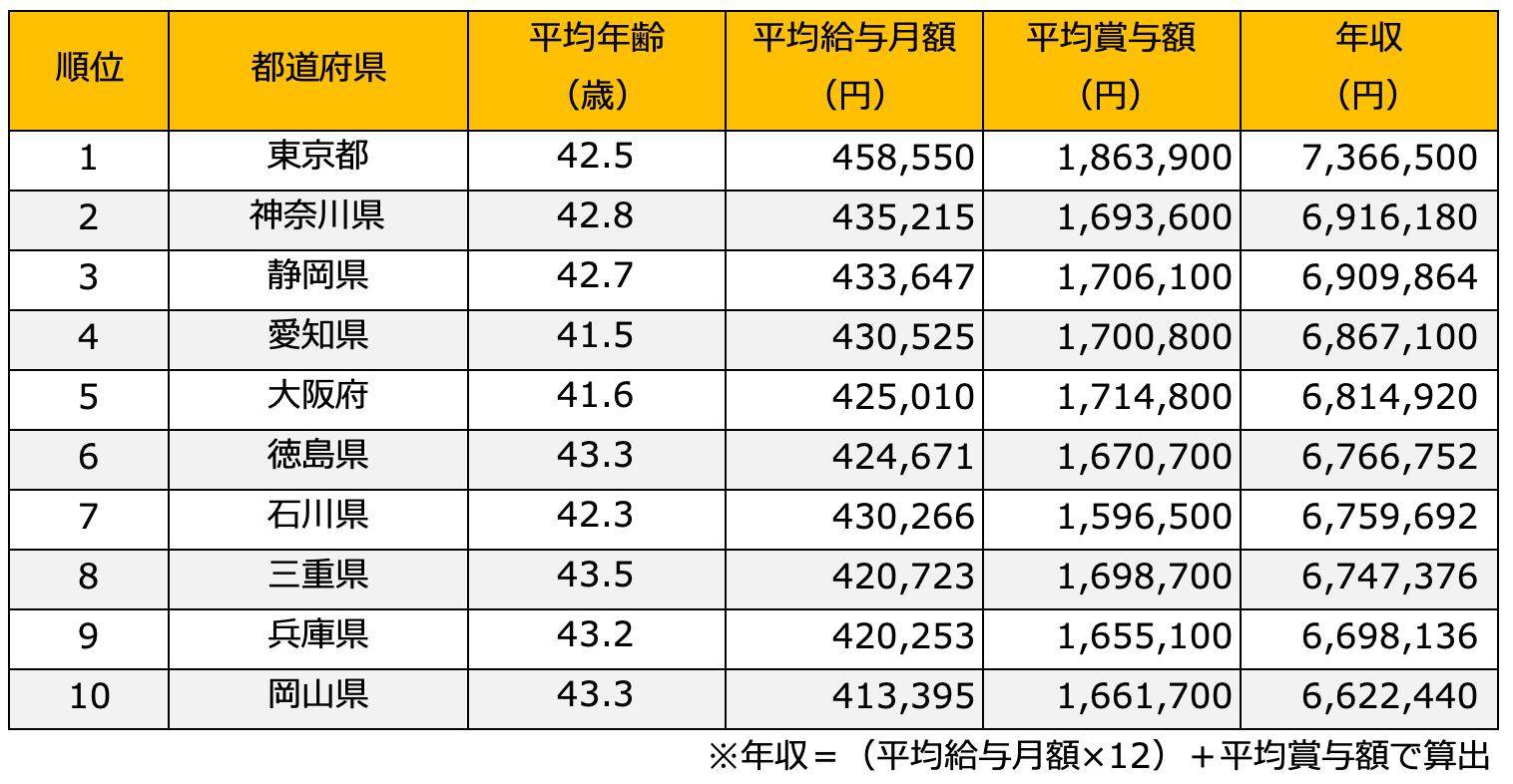 まず、公務員の年収が高い都道府県ベスト10は以下のとおりです。年収は一般行政職の「(平均給与月額×12)+平均賞与額」の合計で算出しています。また、平均賞与額は「期末手当」と「勤勉手当」の合計。一般企業と違い、公務員の賞与は法律や条例で支給することが定められています。