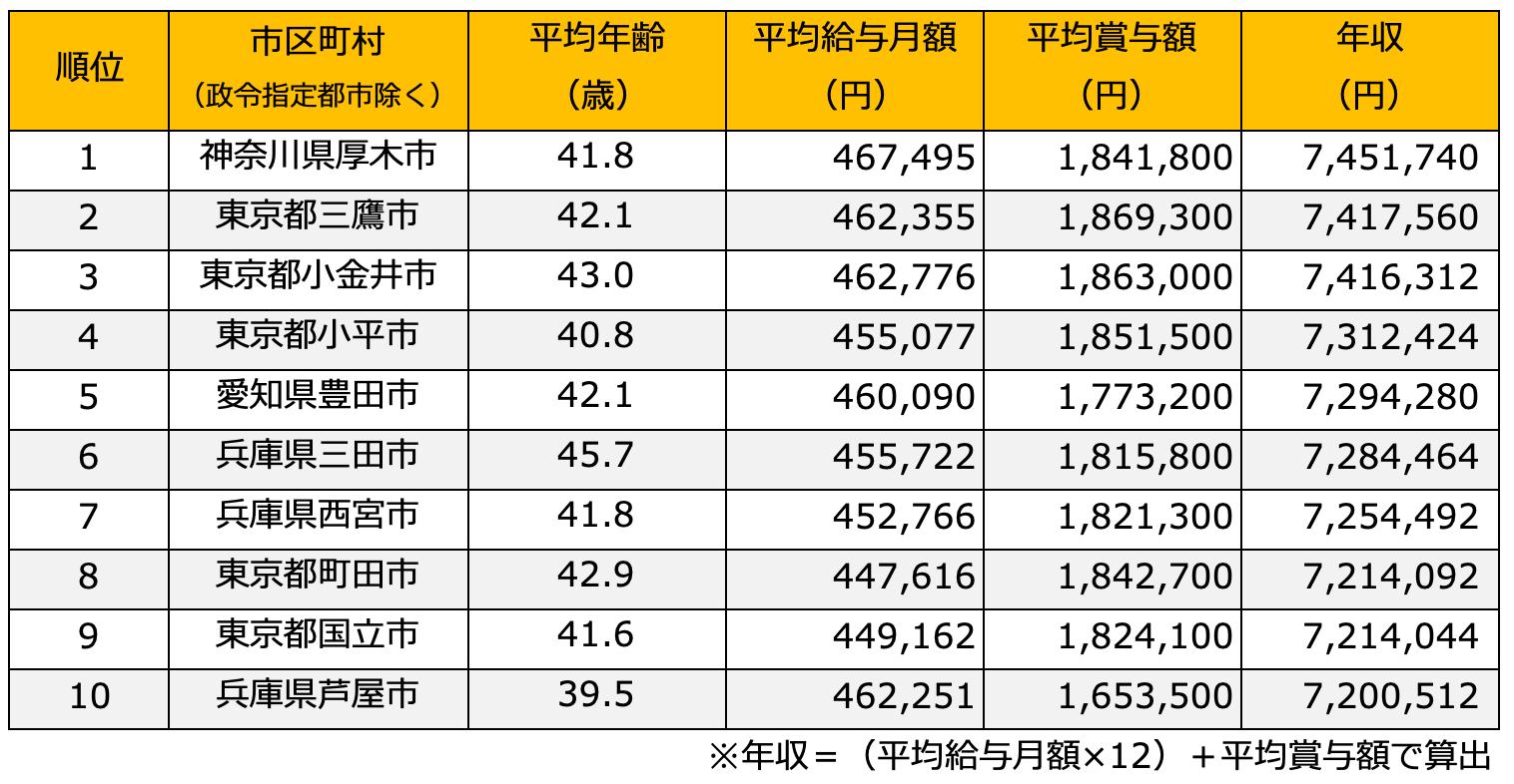 トップは神奈川県厚木市で745万円。2位以下には東京都の市部や兵庫県が目立ちます。このランキングには東京23区が含まれているのですが、意外にもトップ10には入りませんでした。なお、このランキングには政令指定都市が含まれていません。