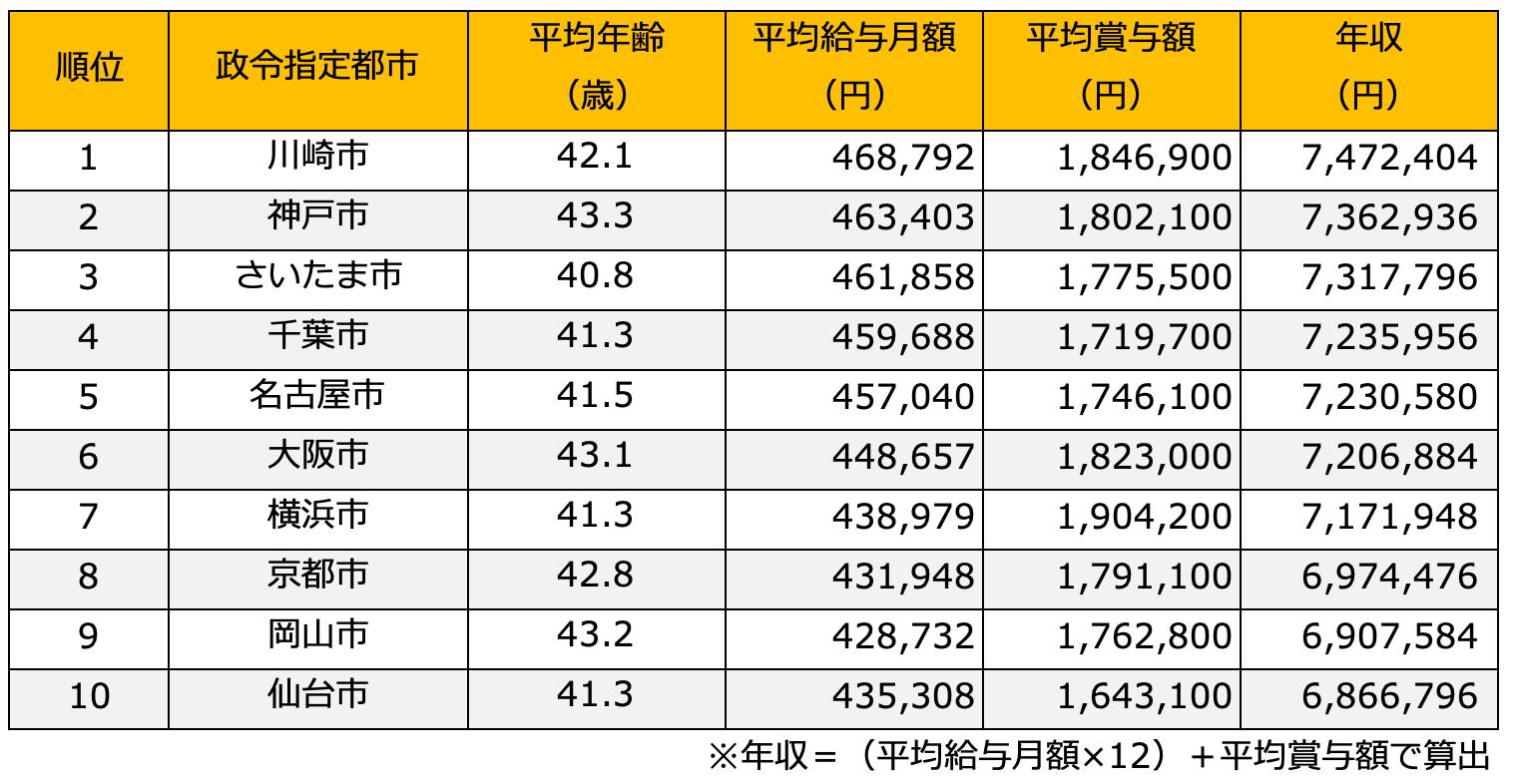 公務員の年収が高い政令指定都市ベスト10は、次のようになっています。