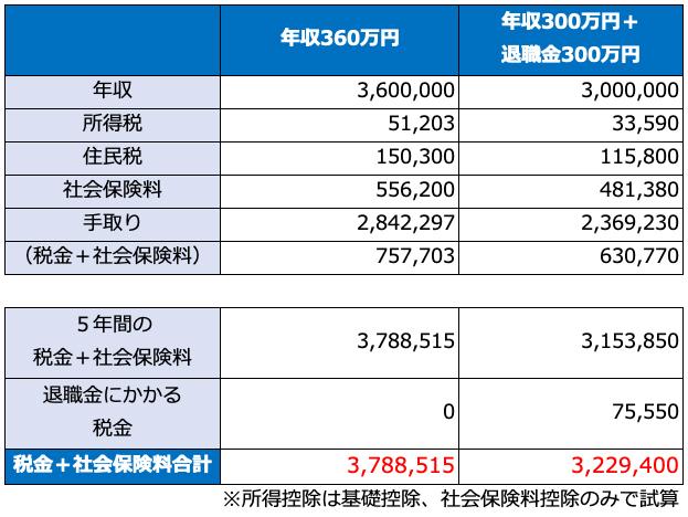 図は、年収360万円と年収300万円+退職金300万円の場合で、税金+社会保険料合計がいくら変わるかをしめしたものです。年収360万円の場合、5年間の税金+社会保険料合計は約379万円なのに対し、年収300万円+退職金300万円の場合は約323万円ですから、差し引き約56万円の節税効果があることがわかります。