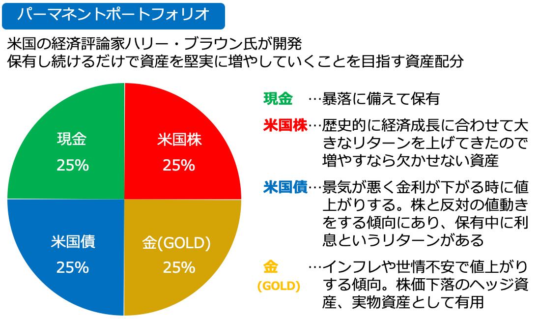 不確実性のあるマーケットにおいて、なるべくどのような状況でも安定したリターンを目指す戦略が「パーマネントポートフォリオ」です。米国の経済評論家、ハリー・ブラウン氏が開発しました。
