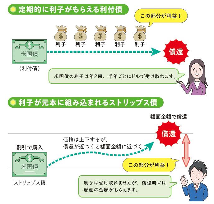利付債は保有中、半年に一度利息がもらえる債券。ストリップス債は割引債のことで、額面よりも割引された価格で購入して、償還時には額面(100)で戻ってくるため、購入金額と額面の差額分が利益になります。