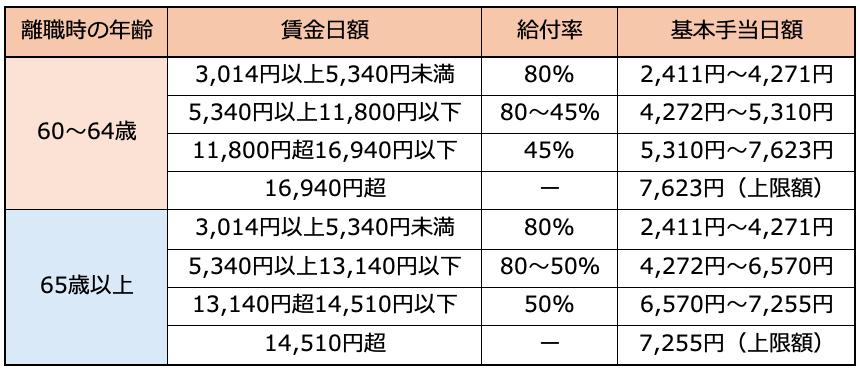 基本手当・高年齢求職者給付金の支給金額は、離職前の賃金日額に応じて算出されます。基本手当の上限は7623円(60~64歳)、高年齢求職者給付金の上限は7255円となっています(2025年(令和7年)8月1日からの金額)。