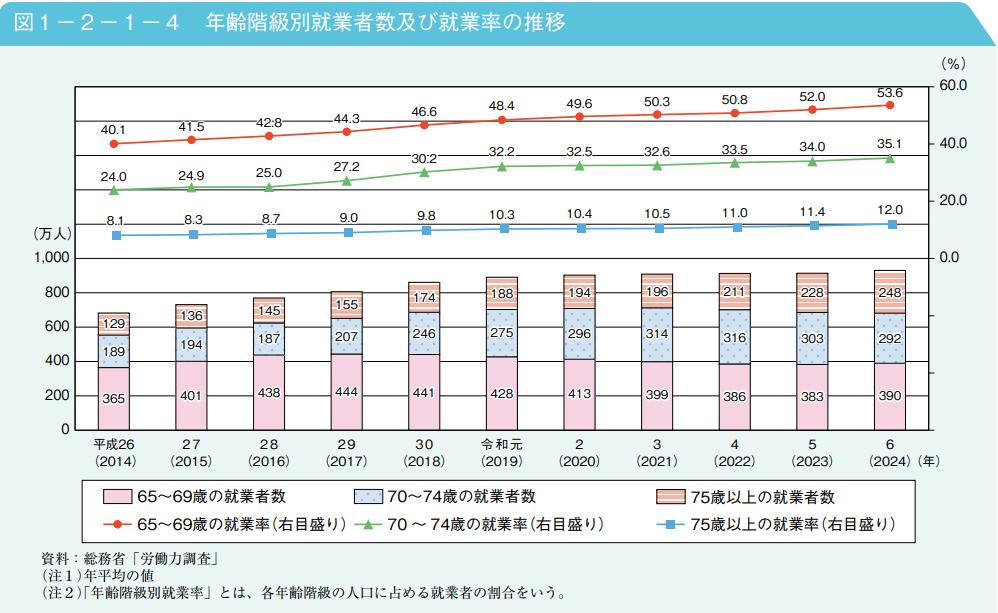 内閣府「令和7年版高齢社会白書」によれば、2024年の労働力人口に占める65歳以上の者の割合は13.6%で、就業者数及び就業率は長期的に上昇傾向にあります。特に65歳以上の就業者数を見ると、21年連続で前年を上回っています。