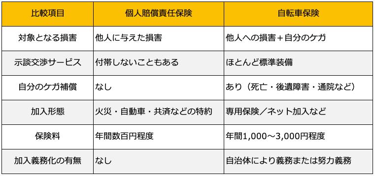 <個人賠償責任保険と自転車保険の主な違い>