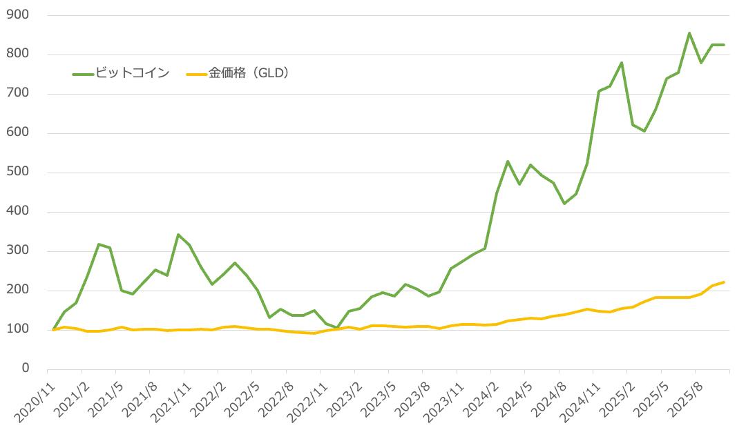 金価格は最近値上がりしたことを受け、指数も100から、2025年10月末時点で220.9まで上昇しています。しかし、ビットコインはそれよりもはるかに上昇し825.9となっています。