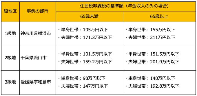 住民税が非課税になる基準額は、3つの級地区分(1級地・2級地・3級地)により異なります。1級地は東京23区を含む大都市、2級地は中規模都市、3級地はその他の都市が該当します。