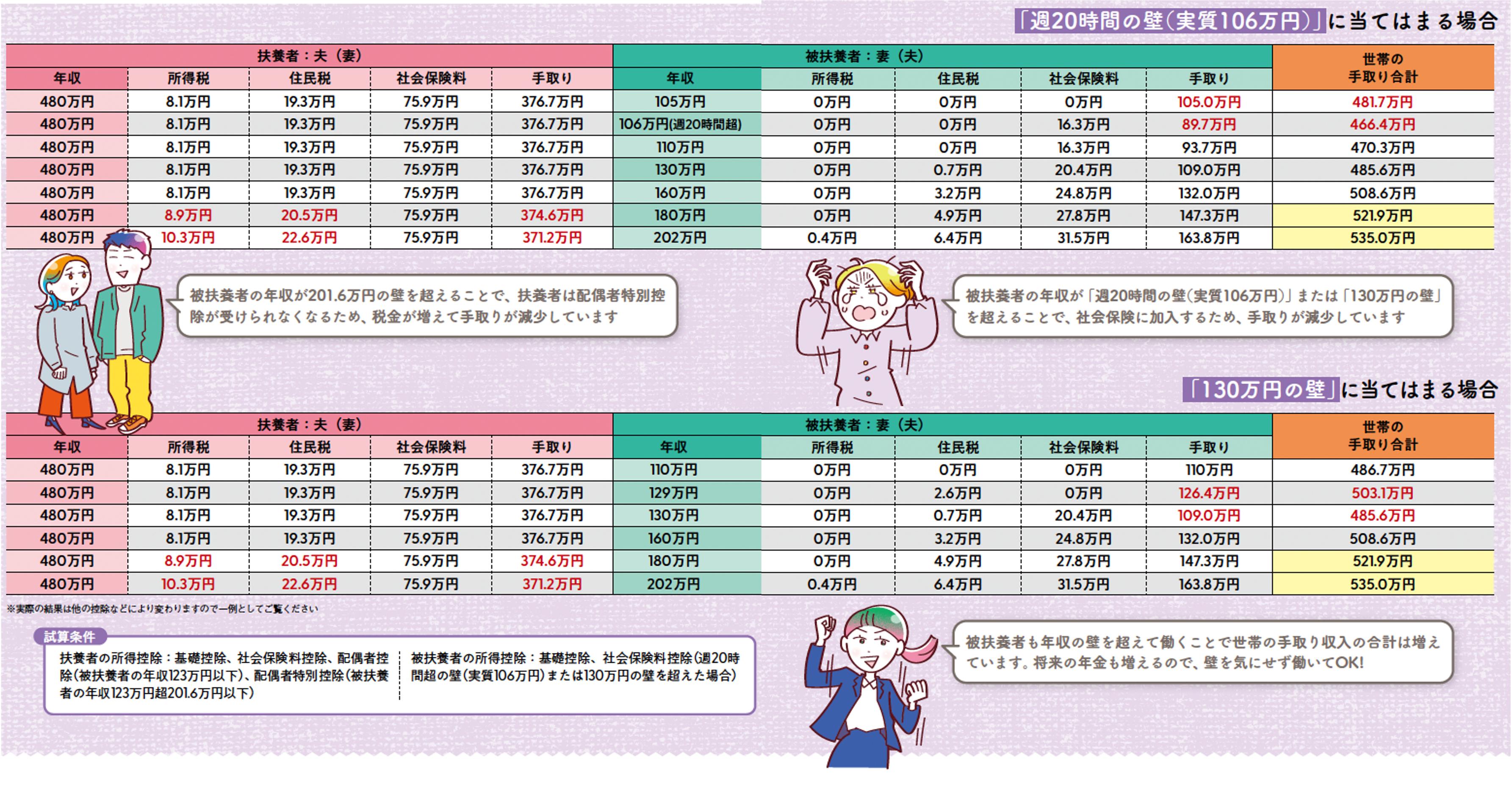 壁を超えたときに夫婦の世帯手取りがどうなるかをシミュレーションしてみましょう。