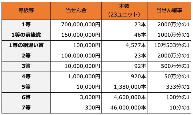 宝くじ公式サイトには23ユニットでの当せん本数が記載されています。2000万枚×23ユニット(4億6000万枚)を当せん本数で割ると各等の当せん確率がわかります。