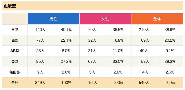しかしこれは、日本人の血液型がA型40%、O型30%、B型20%、AB型10%(日本赤十字社より)の割合と合致しているので、驚くような結果ではないかもしれません。