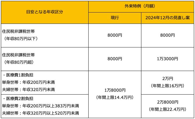 2024年12月の見直し案では、住民税非課税世帯(年週80万円以下)に関しては変更なしですが、住民税非課税世帯(年収80万円超)においては8000円→1万3000円で、月々の負担は5000円増、年間では6万円増となっていました。