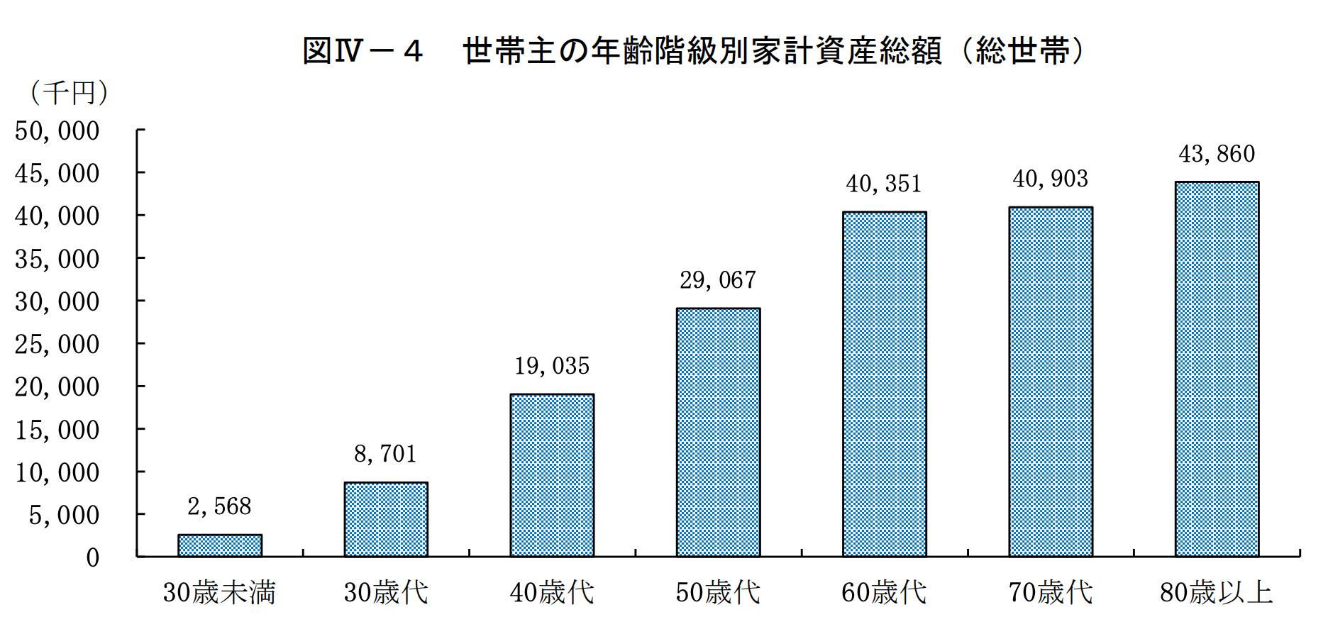 総務省統計局の「全国家計構造調査」(2019年)によれば、世帯主年齢・区分別の家計資産総額は、70代が4090.3万円、80代が4386万円と年齢階級が高くなるほど多くなっており、80代が最高になっています。