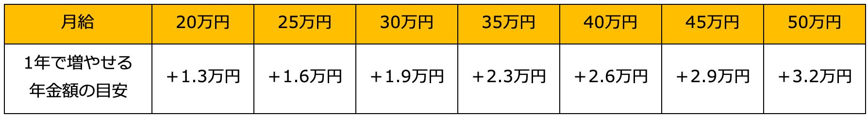 増やせる年金額は、厚生年金保険に加入した期間とお給料の額によって変わります。1年間厚生年金保険に加入した場合に増える月給別の年金額の目安は以下の表を参考にしてください。