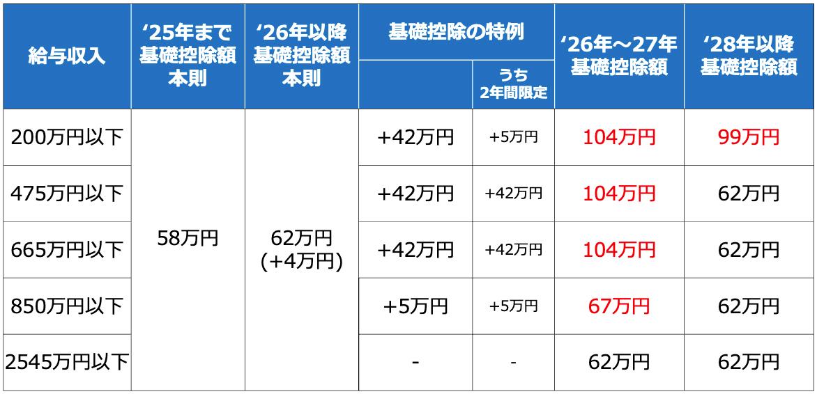 給与収入200万3999円以下の基礎控除の特例42万円のうち5万円と、給与所得控除200万4000円以上の基礎控除の特例は2026年・2027年の2年間限定です。2028年以降は基礎控除の特例が受けられなくなります。