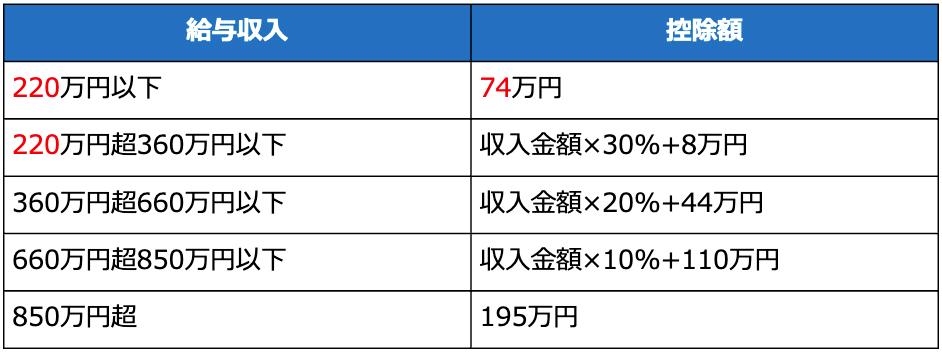 さらに、2026年・2027年分の給与所得控除の最低保障額は、特例で5万円引き上げられることになりました。給与収入が220万円以下の場合、給与所得控除は74万円受けられます。給与収入が220万円超の場合は、「控除額」欄の計算をすることで給与所得控除の金額がわかります。給与収入が850万円超であれば、給与所得控除の金額は一律で195万円です。