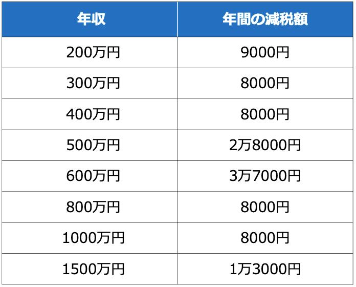 以上の変更を踏まえて、単身世帯または配偶者控除が適用されない共働き世帯の給与所得者の年間の減税額を試算しました。減税の効果は広範囲に及びますが、年収500万円~600万円といった中間層への恩恵が大きいことがわかります。