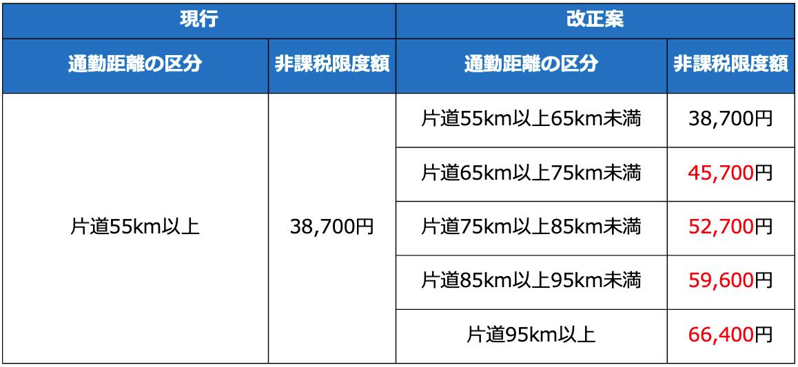 今回、新たに通勤距離が65km以上~95km以上までの区分が10km刻みで設けられ、非課税限度額がさらに引き上げられることになりました。