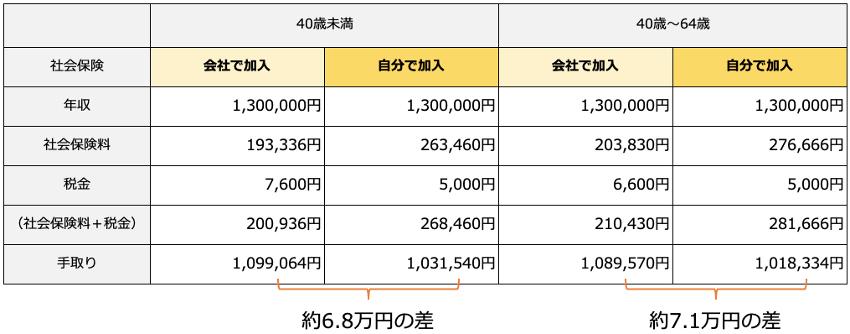 年収130万円の人が会社の社会保険に加入する場合と自分で社会保険に加入する場合で、社会保険料や手取りにどの程度の差があるかを計算したのが次の表です。