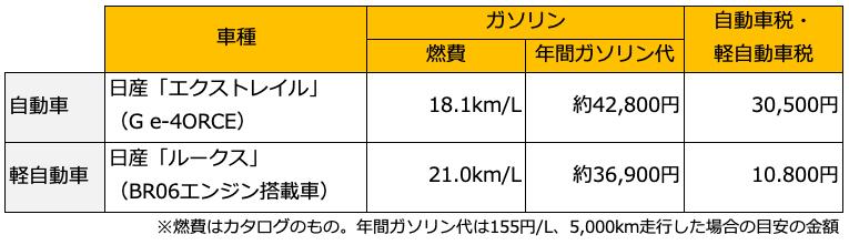 普通自動車と軽自動車のガソリン代と自動車税・軽自動車税の目安の金額を見てみましょう。車種によっても異なるため、ここでは日産「ルークス」(BR06エンジン搭載車)と日産「エクストレイル」(G e-4ORCE)を比較してみました。