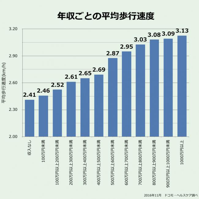 ドコモ・ヘルスケア株式会社が2016年11月に発表したデータによれば、日本の平均年収を含む「年収400万円以上500万円未満」の層の平均歩行速度2.69km/hに対して、「年収1,000万円以上」の層では平均歩行速度3.13km/hという結果が得られました。