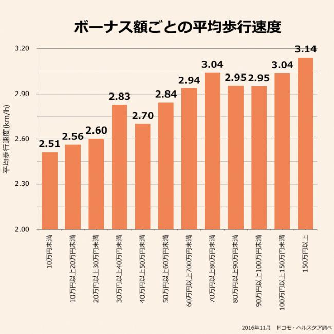 また、ボーナス額と平均歩行速度の間にも同様の関係があるとのこと。ボーナスが多いほど、歩行速度が速くなる傾向が見られます。