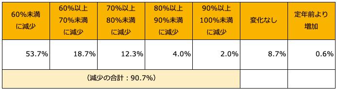 独立行政法人労働政策研究・研修機構が2023年に実施したアンケート調査「同一労働同一賃金の対応状況等に関する調査」によると、9割以上の人が定年後の再雇用によって収入が減少したと回答しています。