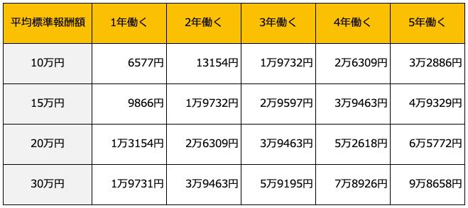 平均標準報酬額や働く期間を変えて計算すると、以下のようになります。