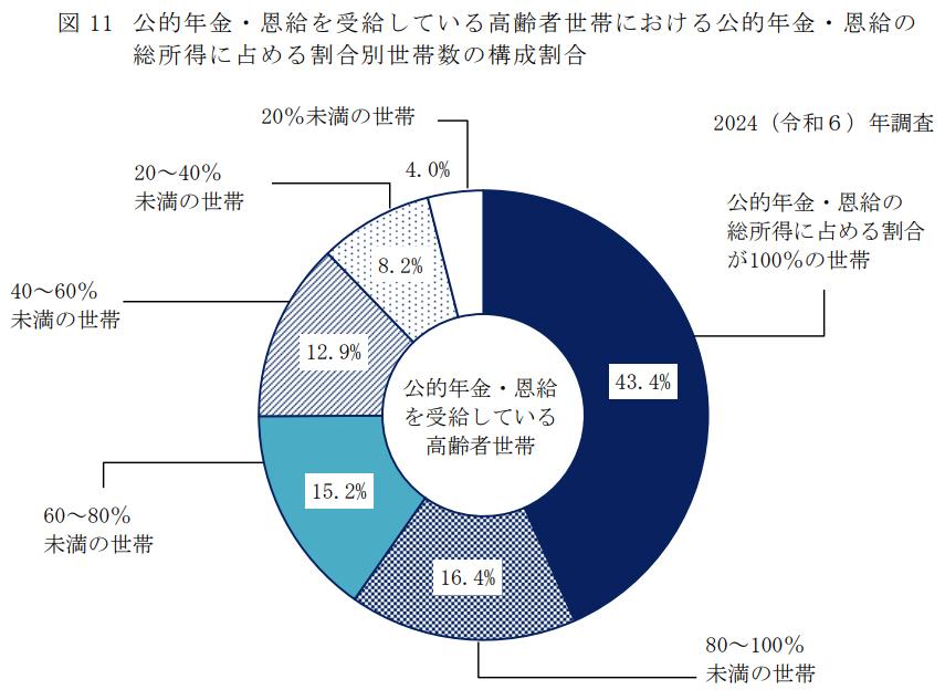 年金だけで生活している高齢者は、どのくらいいるのでしょうか。厚生労働省が公表している「令和6年(2024年)国民生活基礎調査」によると、高齢者世帯のうち 43.4% が「公的年金・恩給のみ」を収入源として生活しています。これは、高齢者世帯のおよそ4割強が、年金以外の収入に頼らずに暮らしているということを意味します。