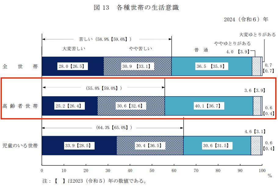 年金だけで生活している高齢者世帯は少なくありませんが、その一方で暮らしが苦しいと感じている人が多いのも事実です。先に紹介した厚生労働省の調査では、高齢者世帯の 55.8% が「大変苦しい」「やや苦しい」と回答しています。半数を大きく超える人が、生活に何らかの負担や不安を感じながら暮らしていることになります。