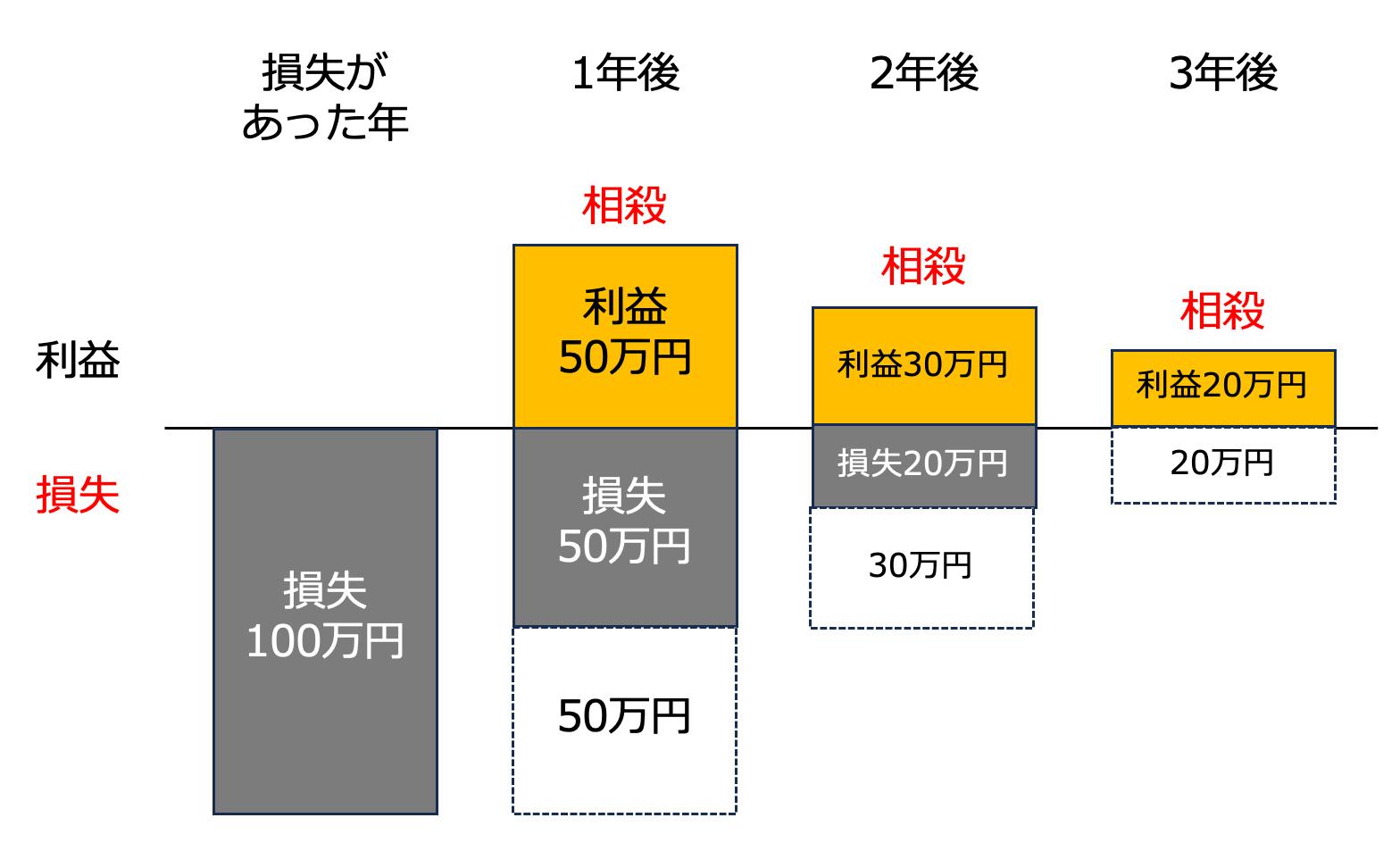 課税口座に損失が100万円あったとします。1年後、50万円の利益と損失を損益通算で相殺したら、残りの損失は50万円です。同様に2年後30万円、3年後20万円と損失を繰り越して相殺することで利益がゼロとなり、利益にかかる税金がゼロにてきます。