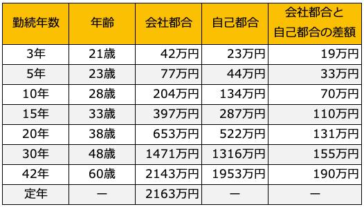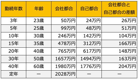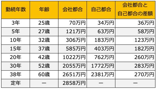 大学を卒業してすぐに入社し、定年まで勤め上げた場合の平均退職金は「2858万円」です。一方、途中で退職する場合の「会社都合」と「自己都合」の差を勤続年数別に整理したのが以下の表です。