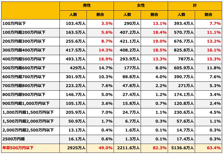 「年収500万円以下」の層が全体に占める割合は、以下の通りです。