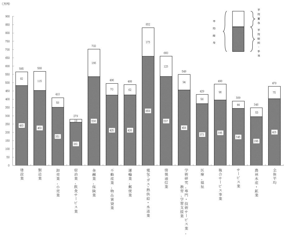 業種別においても、平均給与は最大約550万円もの差が生まれることがわかります。
