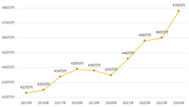 ここ10年間の平均年収の推移を振り返ると、2015年(平成27年)の423万円から2024年(令和6年)の478万円へと、約55万円増加しています。