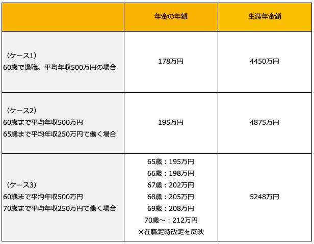 では、60歳で退職する人と、60歳以降は年収が半分になっても65歳や70歳まで働く人とでは、毎月の年金額と生涯年金額はどれくらい差が出るのでしょうか?
