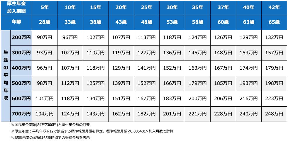 表の縦軸が「生涯の平均年収」、横軸が「厚生年金加入期間」です。各平均年収と厚生年金加入期間の交点の金額が、65歳からもらえる年金額の年額(老齢基礎年金の満額84万7300円+老齢厚生年金の金額)となっています。