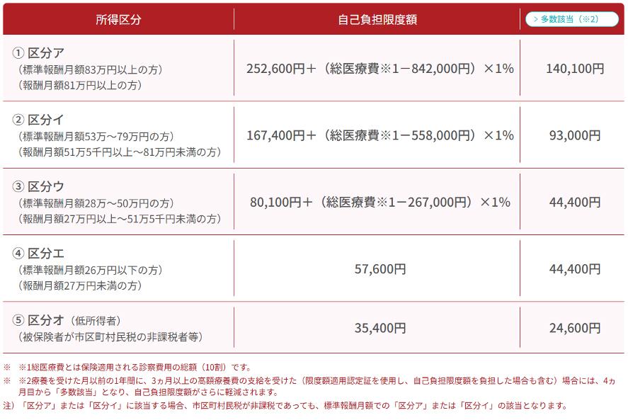 高額療養費制度は、医療費の自己負担額が一定の金額を超えたとき、その超えた分が支給される制度です。70歳未満であれば、所得区分が5つに分かれており、それぞれ自己負担額の上限が異なります。また、直近1年間で3回以上(3か月以上)高額療養費の支給を受けている場合、4回目(4か月目)からは「多数回該当」となり、自己負担限度額がさらに減額されます。