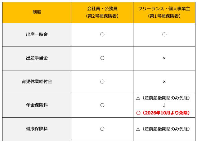 一方で、フリーランスや個人事業主の方が加入する国民年金保険、国民健康保険の場合、現状は産前産後の国民年金保険、国民健康保険のみの免除で、出産手当金や育児休業給付金などの休業中の給付や育児期間中の社会保険料の免除はありません。2026年10月から育児期間中の国民年金保険料免除となることで、フリーランスや個人事業主の子育て世帯の経済的な負担を減らし、子育てしやすい環境が整備されることになります。
