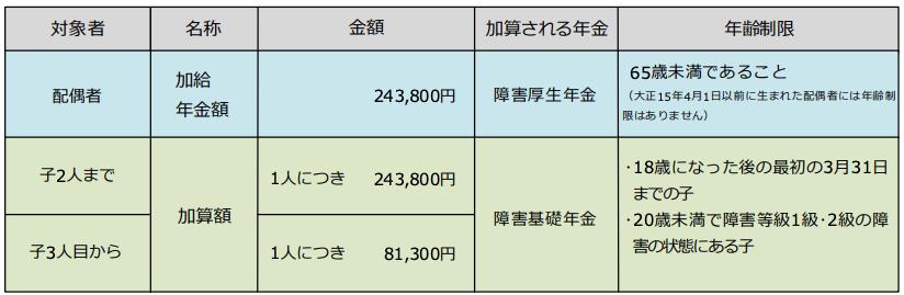 1級・2級の障害基礎年金または障害厚生年金を受け取ることができる方が生計を維持している配偶者(65歳未満)・子ども(18歳年度末までの子、20歳未満で障害等級1級・2級の障害の状態にある子)がいる場合には、加給年金が受け取れます。2026年度の金額は、次のとおりです。