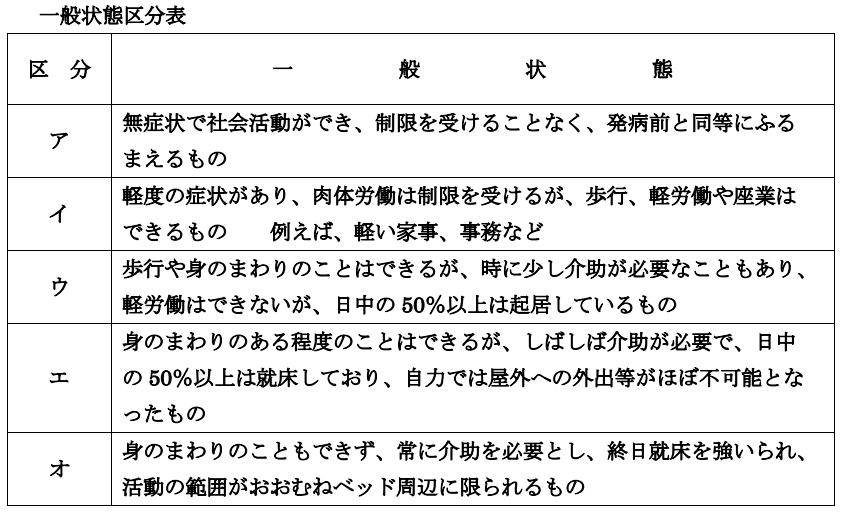 日本年金機構「国民年金・厚生年金保険 障害認定基準」では、がんによる障害の程度を5つに区分しています。